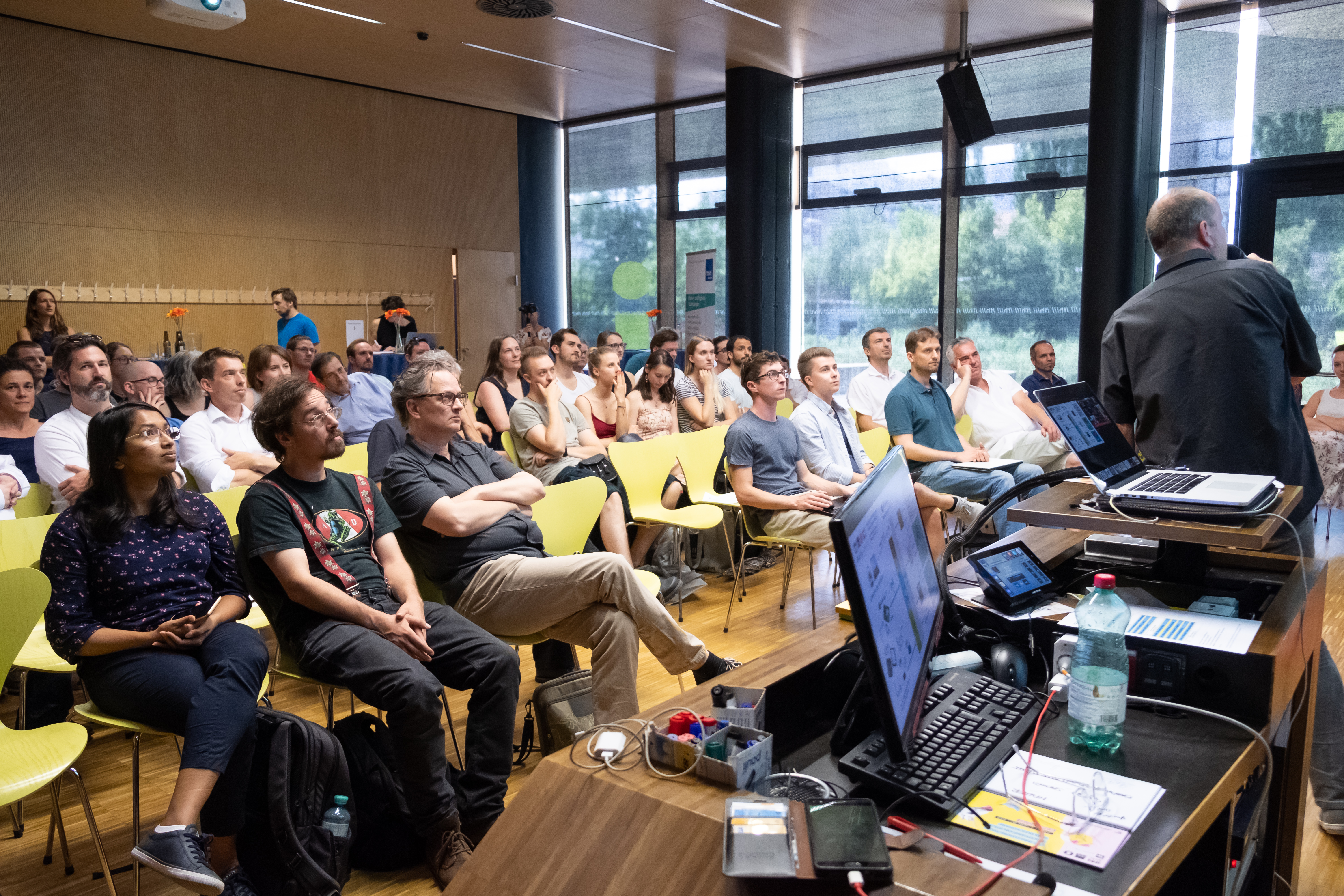 Keynotes von Industrievertreter*innen wie Microtronics, SENSE, AI Austria oder 0bsnetwork haben die Herausforderungen für die Industrie im Bereich Internet of Things & LoRaWAN, künstliche Intelligenz und Blockchain vorgestellt. Darauf folgten Pitches der Industriepartner*innen mit Fragestellungen, bevor es in kleineren Gruppen ans Entwickeln, Tüfteln und idealerweise Lösen dieser ging.