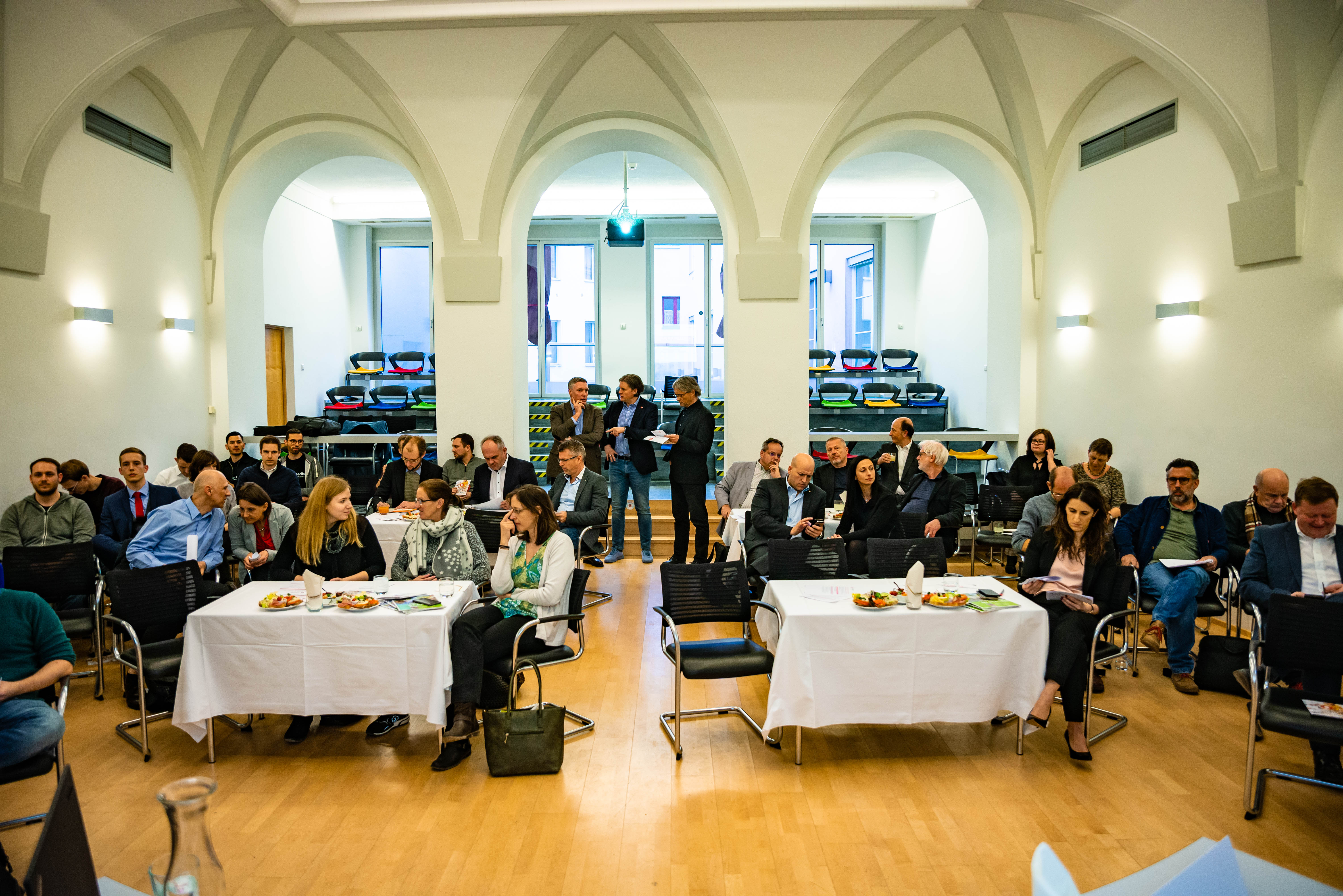 Zu diesen spannenden Fragen diskutierten am Podium Albrecht Grossberger (Geschäftsführer NÖKU), Dominik Mesner (Obmann Plattform 2020) und Hannes Raffaseder (Geschäftsführung FH St. Pölten) mit dem Publikum.